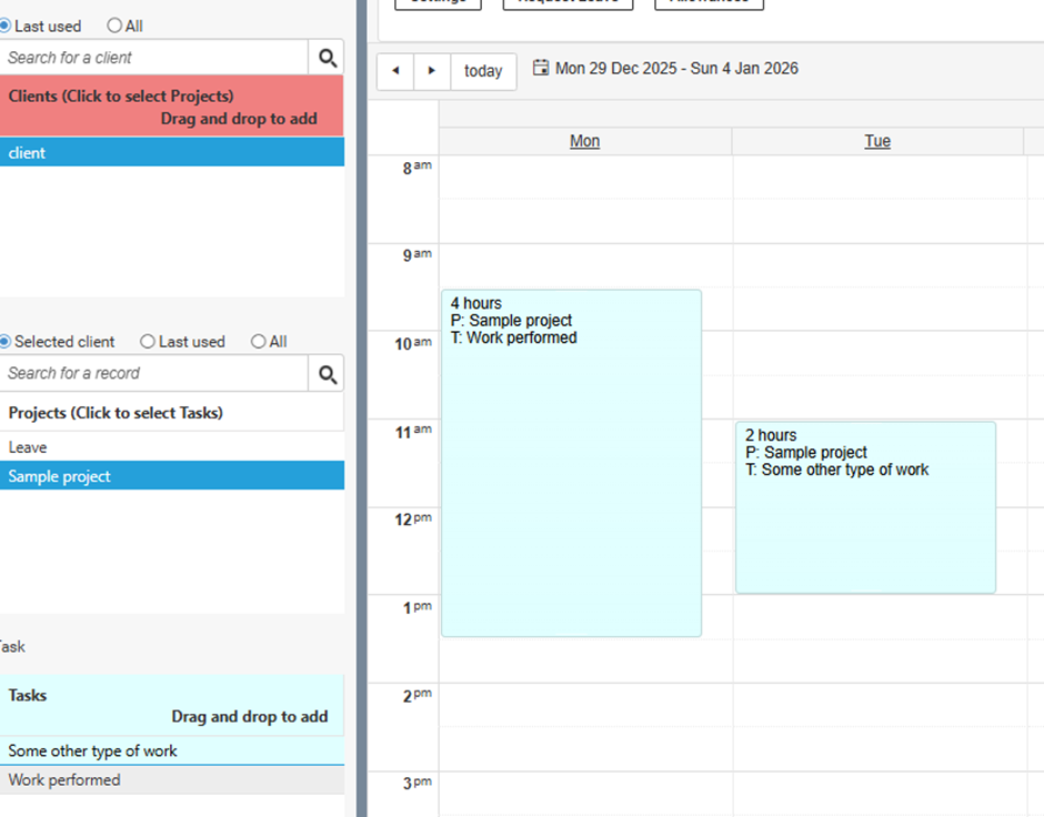 Now the screen will change to the calendar view and you simply select a client/project and then drag the task across to the time slot. You can edit this by dragging and dropping. You can also copy a record or copy it for the remainder of the week (Pic 4).